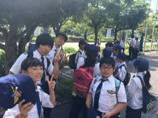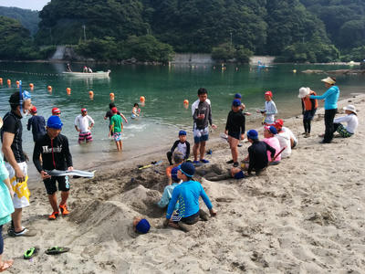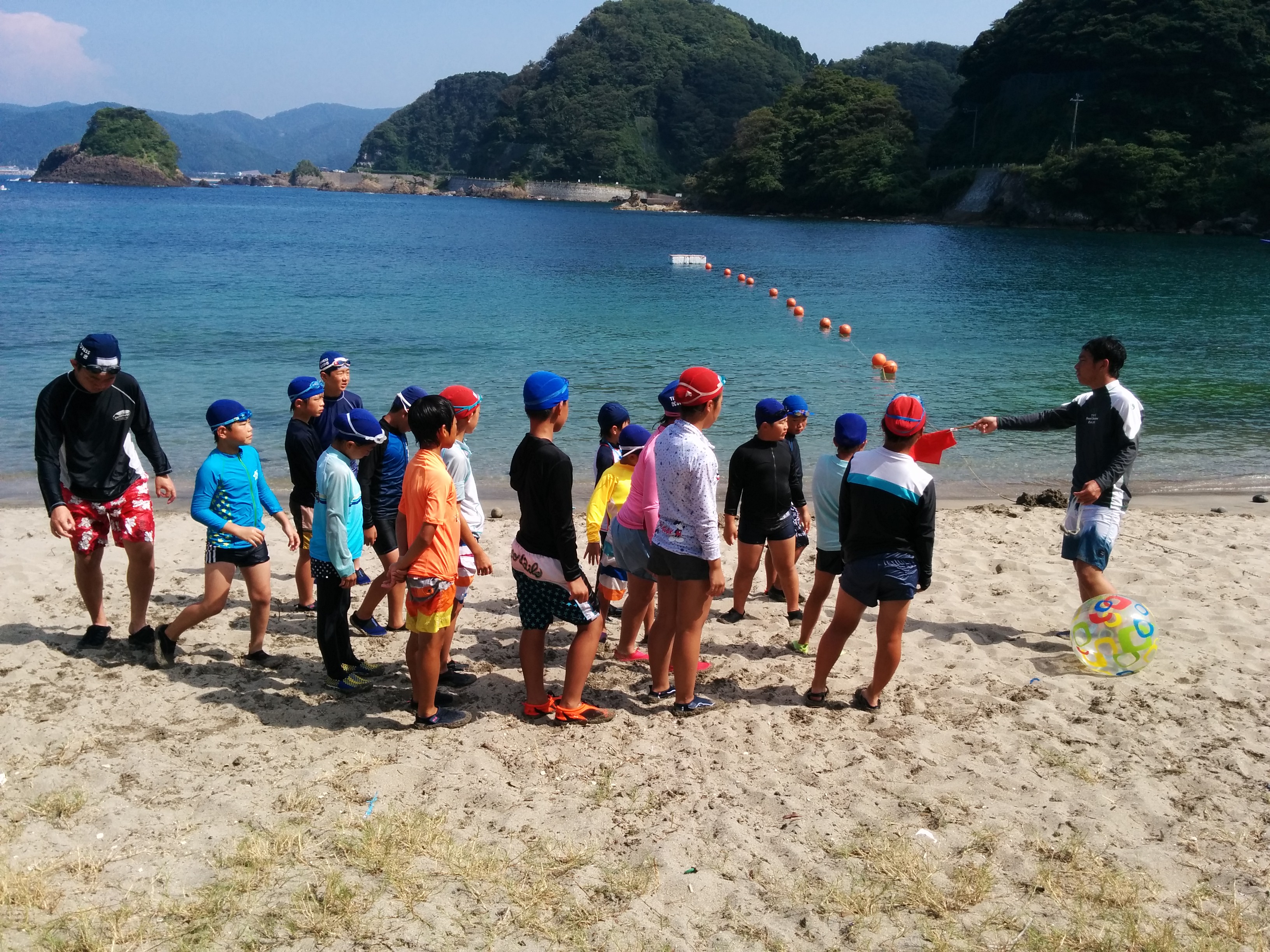 今回も沖の島まで遠泳します。去年いけなかった子もいけた子も