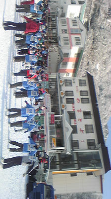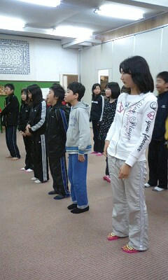 宿の前で体操です。