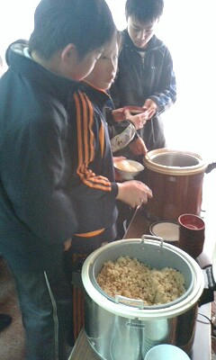 みんなでごはんをよそおいあってます。